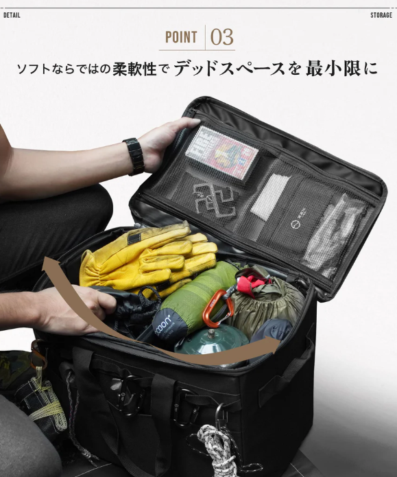 ソフトコンテナならではの柔軟性により、ギアの形に合わせて内部がなじみます。形状の異なる道具をまとめて収納しても、隙間ができにくく、容量を無駄なく使いやすい構造です。