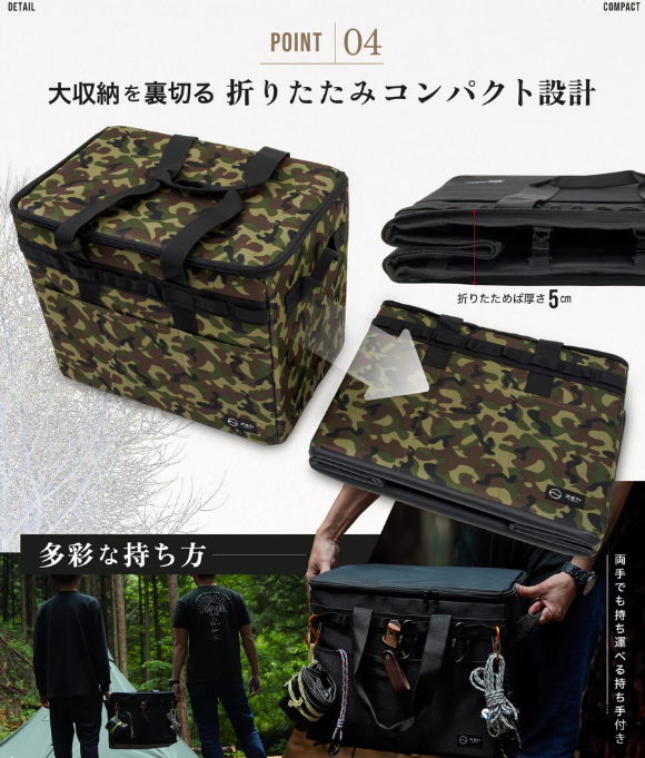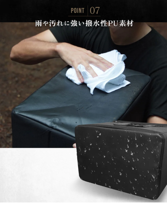 収納ボックスとしてだけでなく、ゴミ袋をセットして簡易ゴミ箱にしたり、薪や汚れ物の仮置きに使える点も便利です。持って行った後に「現地でも使える」のは、実際のキャンプではかなり実用性が高いですよね。