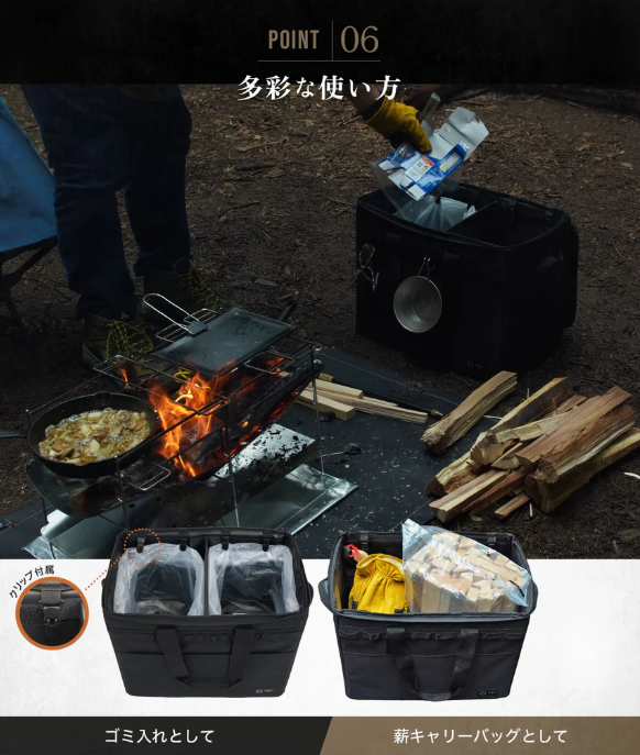 ゴミ袋をセットすれば簡易ゴミ箱として使用でき、薪キャリーとしても活躍します。収納して終わりではなく、役割は多彩で使用用途が広いのもポイント。