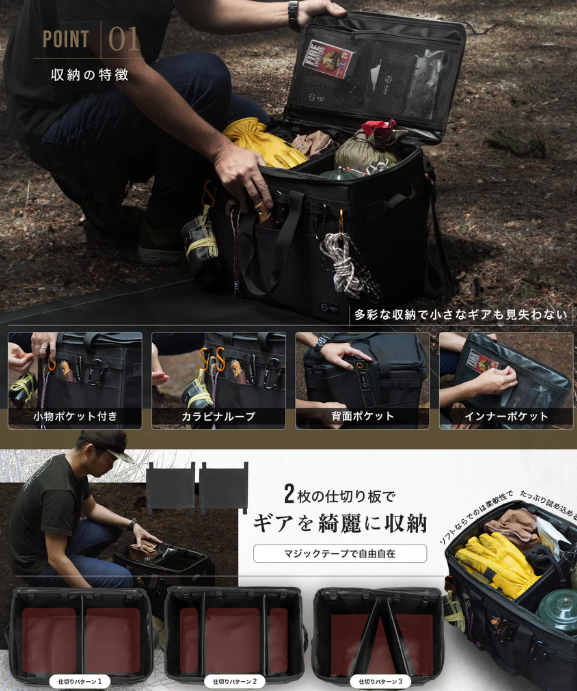2枚の可動式仕切り板と複数のポケットを備え、ギアを用途別に整理しながら収納できます。バーナーやクッカー、小物類を分けて収められるため、中身が混ざりにくい構造です。外側のポケットやループも活用しやすく、撤収や次回準備がスムーズになりますよね。
