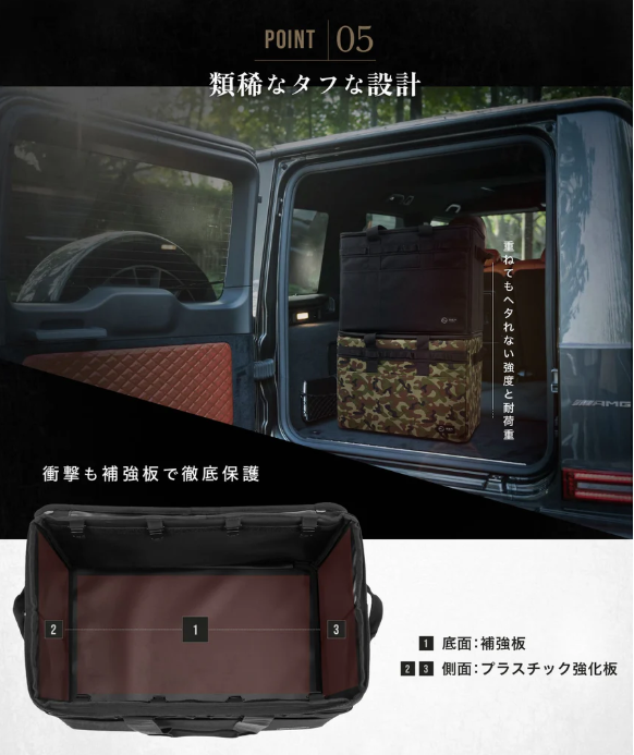 底面と側面に補強板を内蔵し、ソフトタイプでもしっかり自立します。車載時の積み重ねやサイト内での設置でも形が崩れにくく、安心感がありますよね。