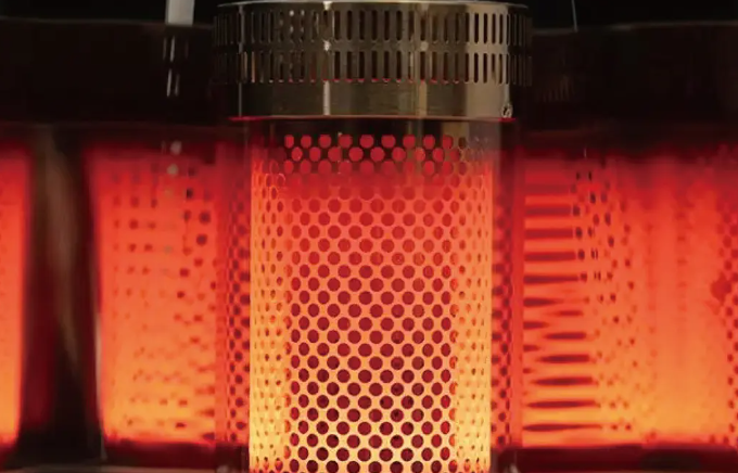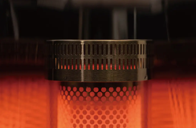 穴の開いた円筒型の鉄板が熱せられて赤熱し、遠赤外線を発生させる仕組みです。炎が直接見えるタイプとは違い、赤くなった部分からじんわりとした熱が広がります。近くにいると、表面だけでなく体の芯まで温まっていくような感覚があるんですよね。